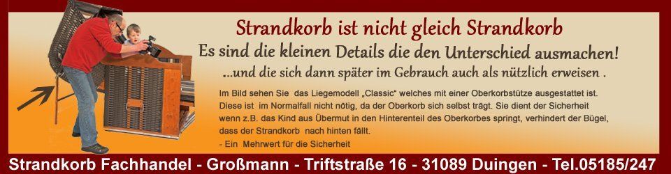 Seit über 25 Jahren sind wir die Firma Großmann ein Strandkorb Fachhandel und Strandkorb Fachhändler in Duingen und Vertragshändler der Strandkorb Manufaktur Sonnenpartner. Die besonderen Qualität Merkmale bei der Verarbeitung und den verarbeiteten Materialien sind ein Garant für die Langlebigkeit dieser Strandkörbe, daher verkaufen und empfehlen wir unseren Kunden diese aus Überzeugung und mit gutem Gewissen.