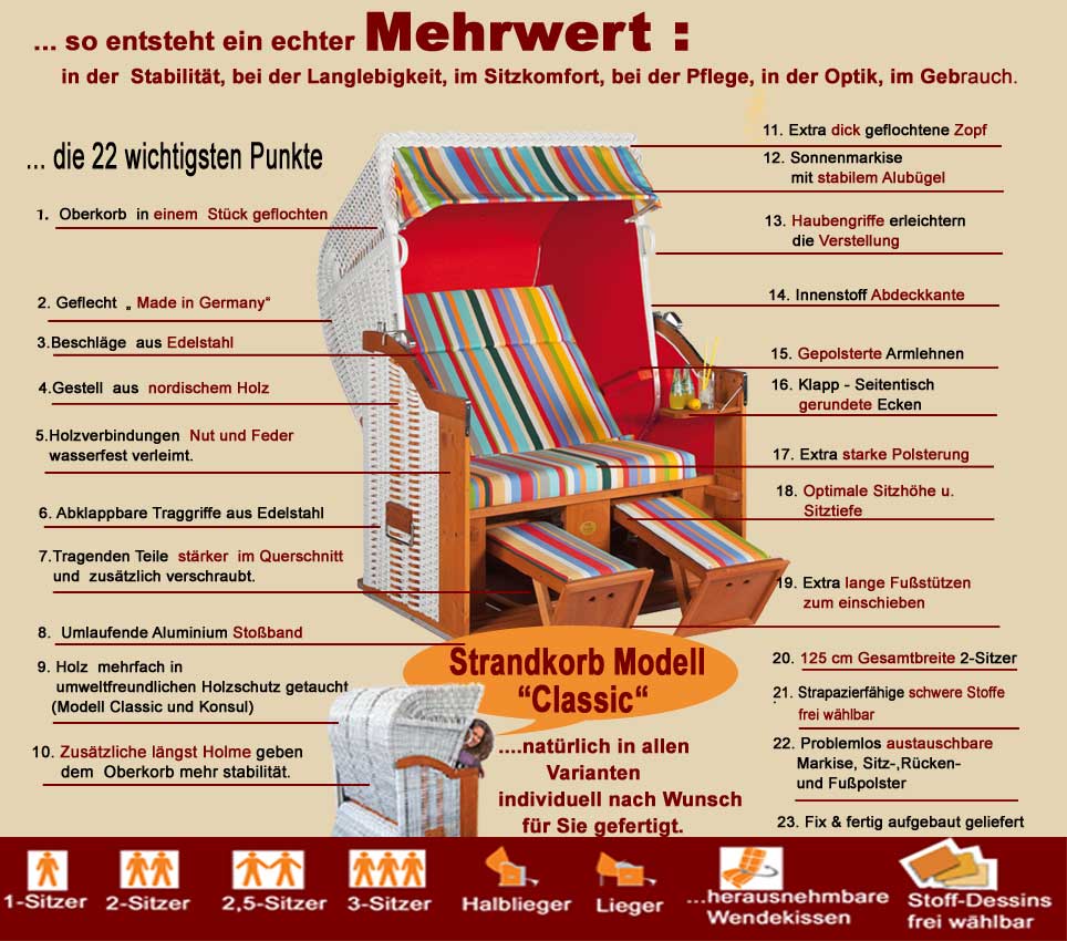 Als Einsitzer Strandkorb der sogenannte Single-Strandkorb, als Zweisitzer Strandkorb der Meistgekaufte, als XXL Strandkorb für 2,5 Personen und auch als Dreisitzer Strandkorb in natürlich allen Ausstattungs- und Kombination Varianten.